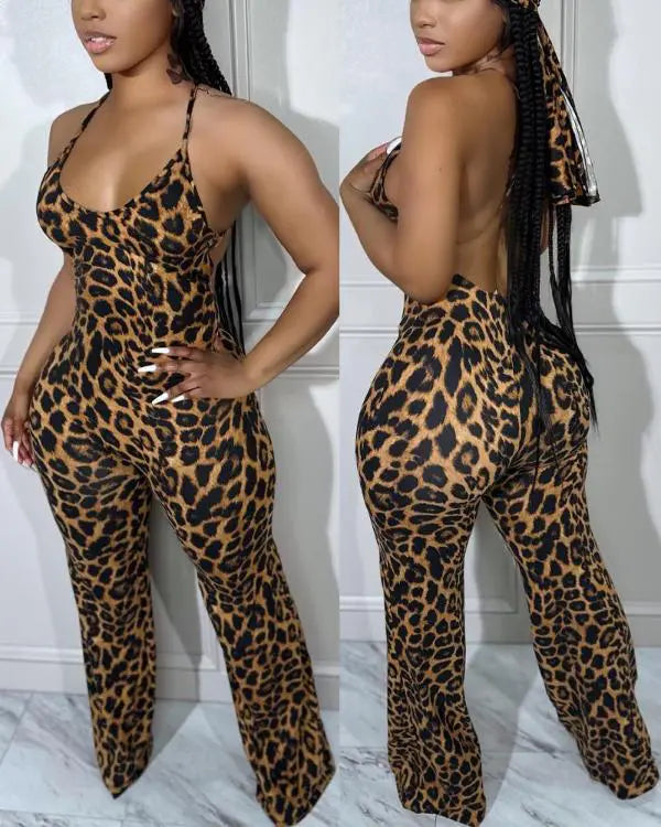 Leopard Print Spaghetti Strap Backless Jumpsuit