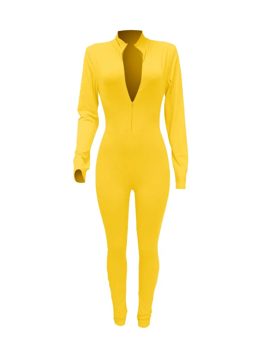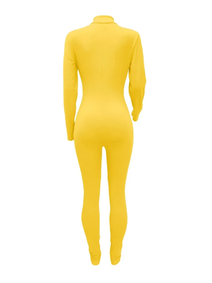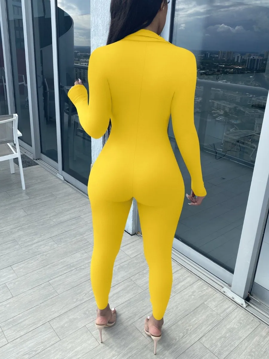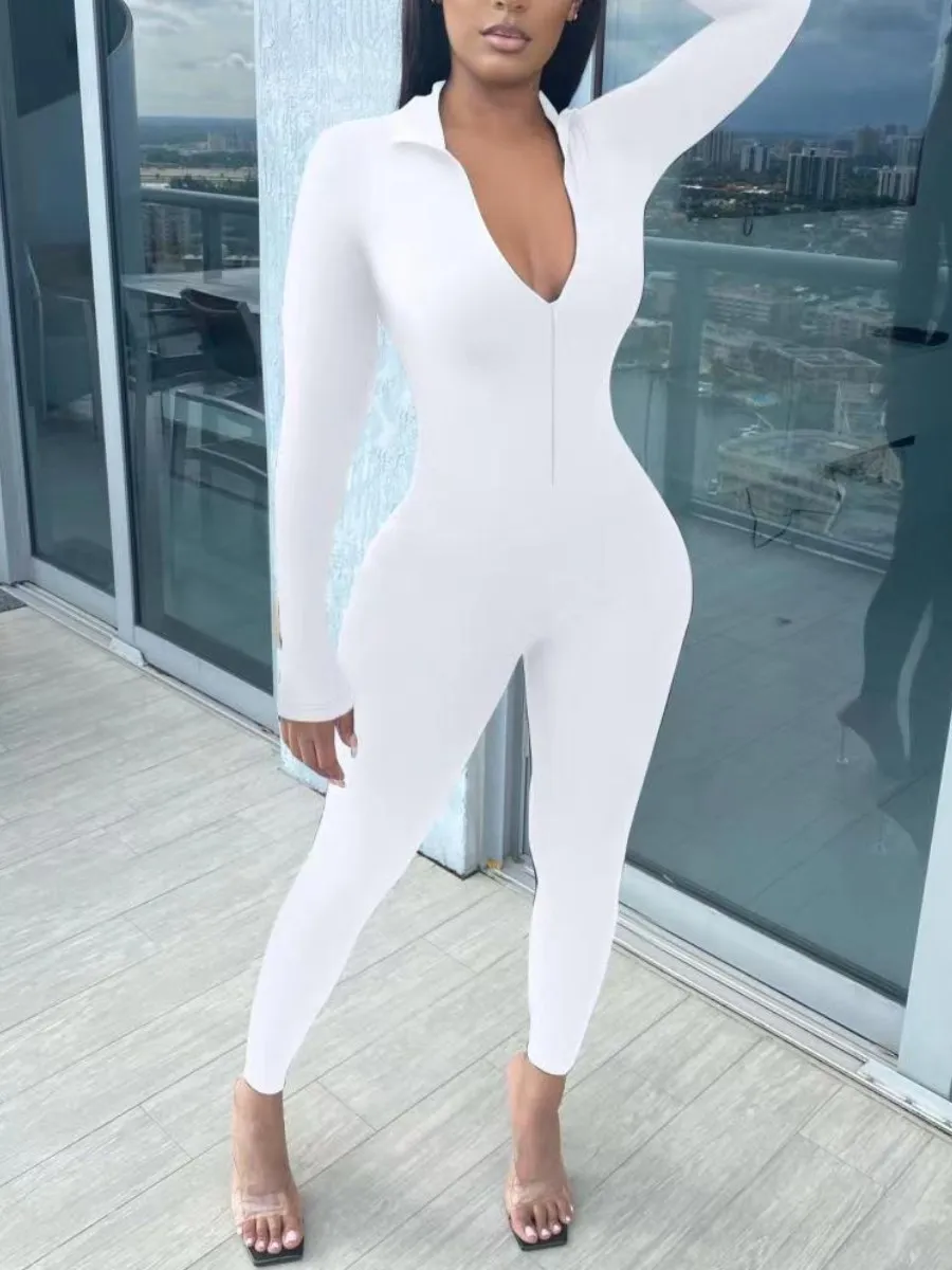 LW 1PC Turndown Collar Zipper Design Jumpsuit Long Sleeve Sexy Casual Street Plain One Piece Skinny Women Autumn Rompers