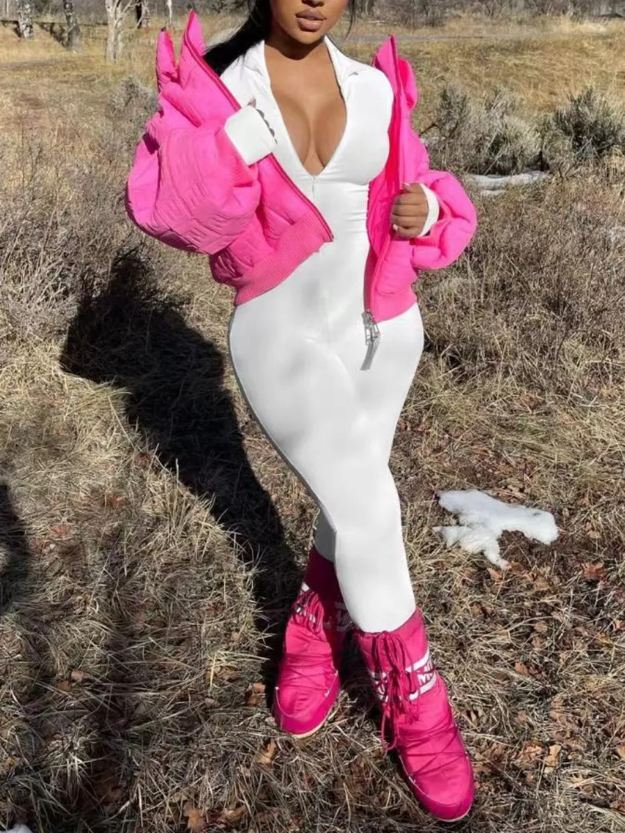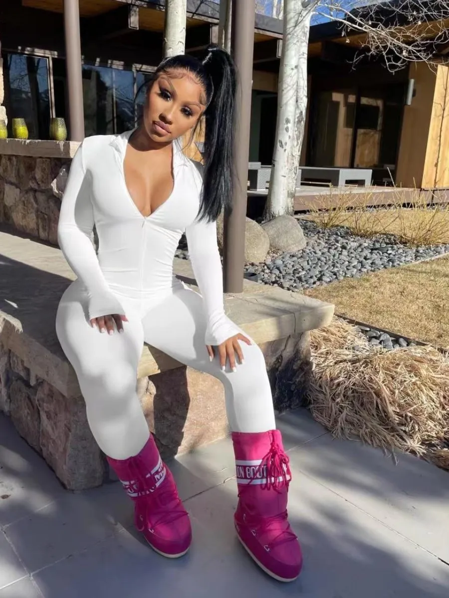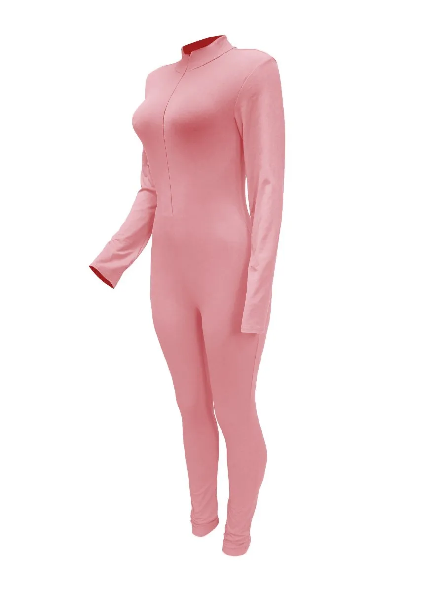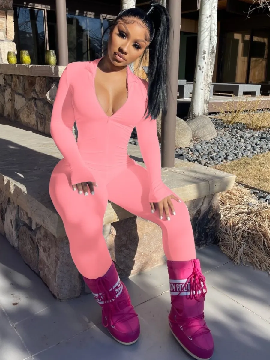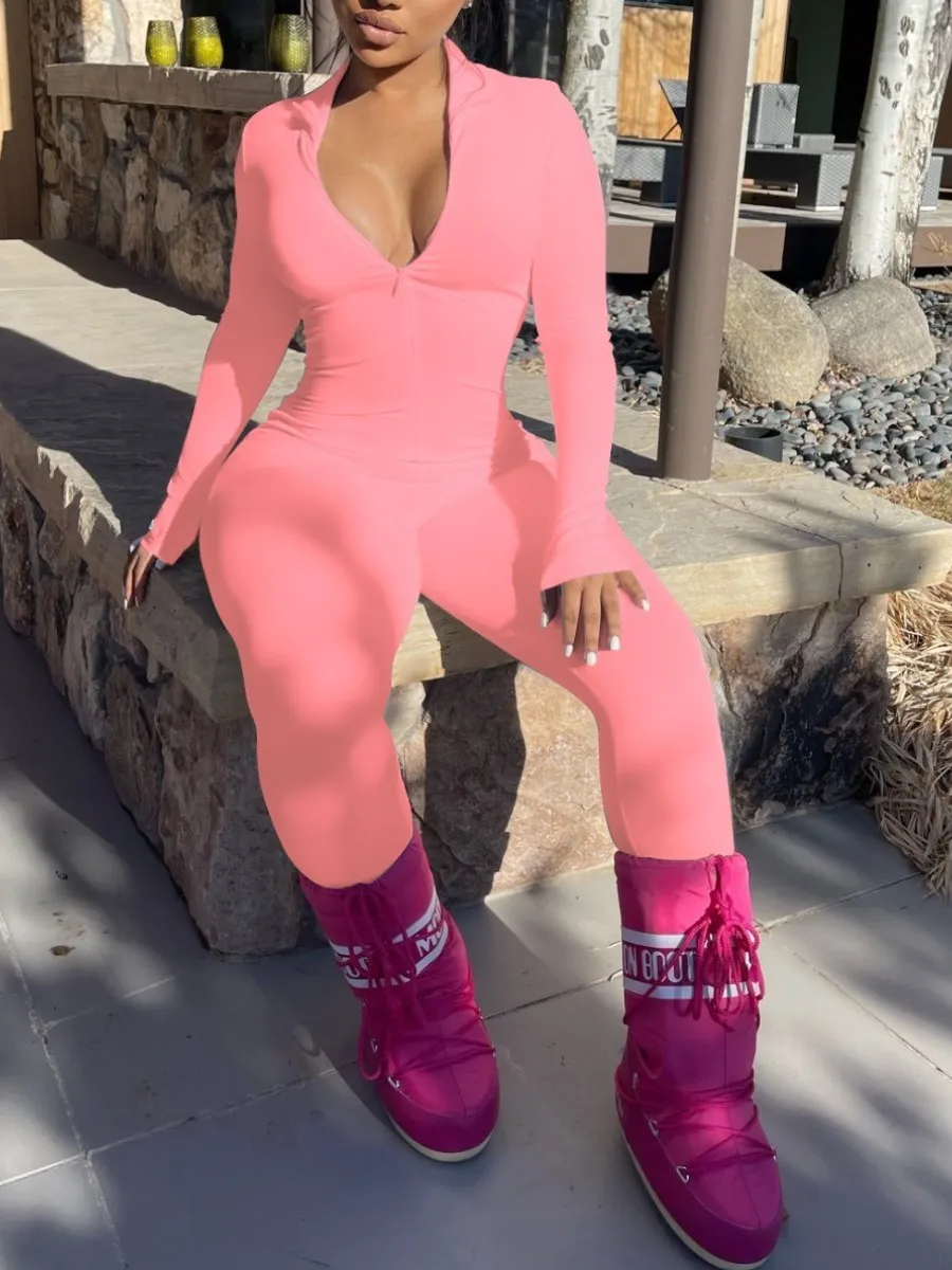 LW 1PC Turndown Collar Zipper Design Jumpsuit Long Sleeve Sexy Casual Street Plain One Piece Skinny Women Autumn Rompers