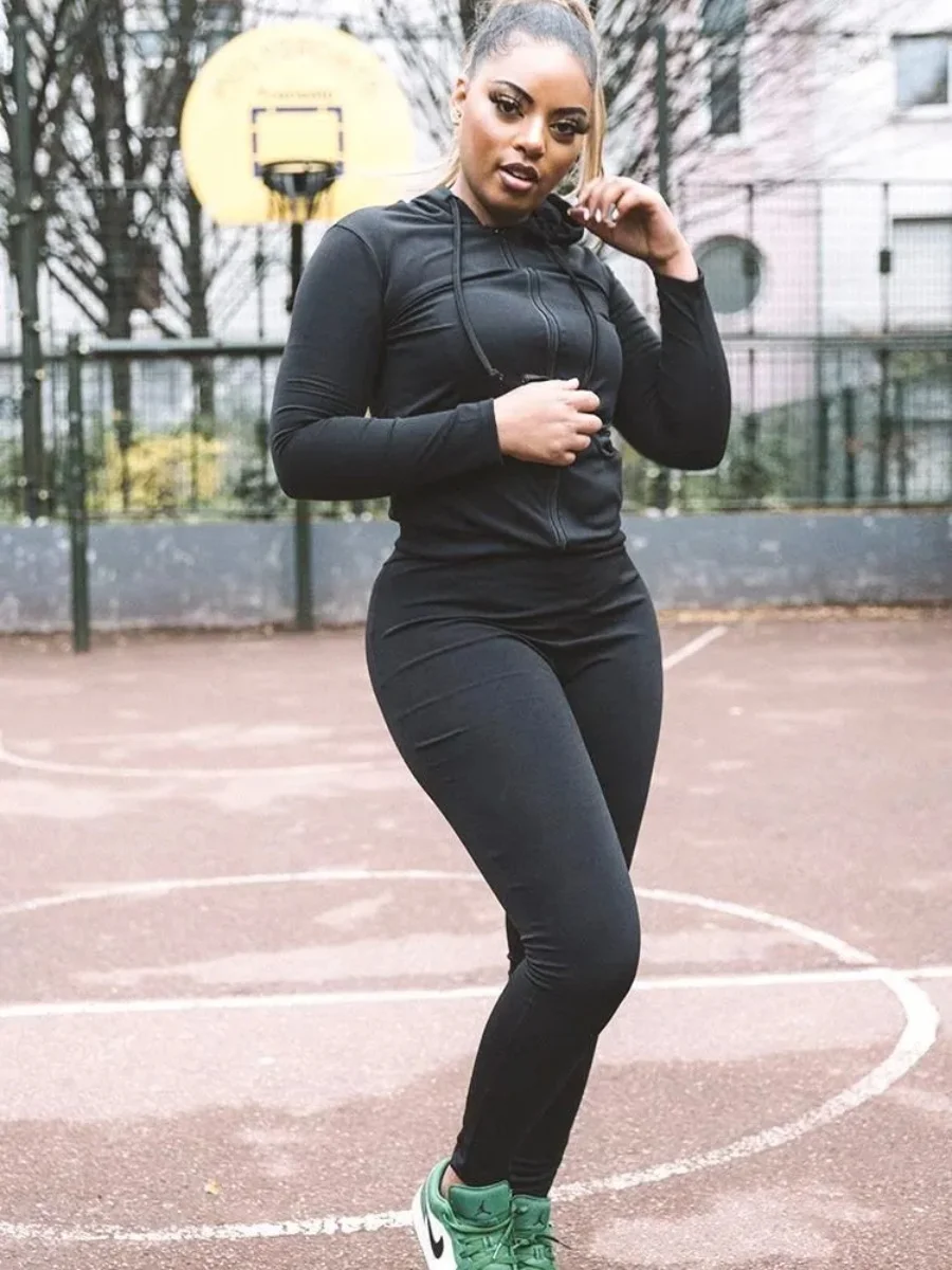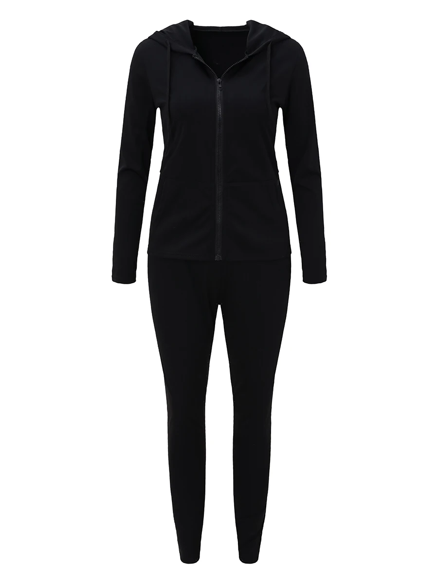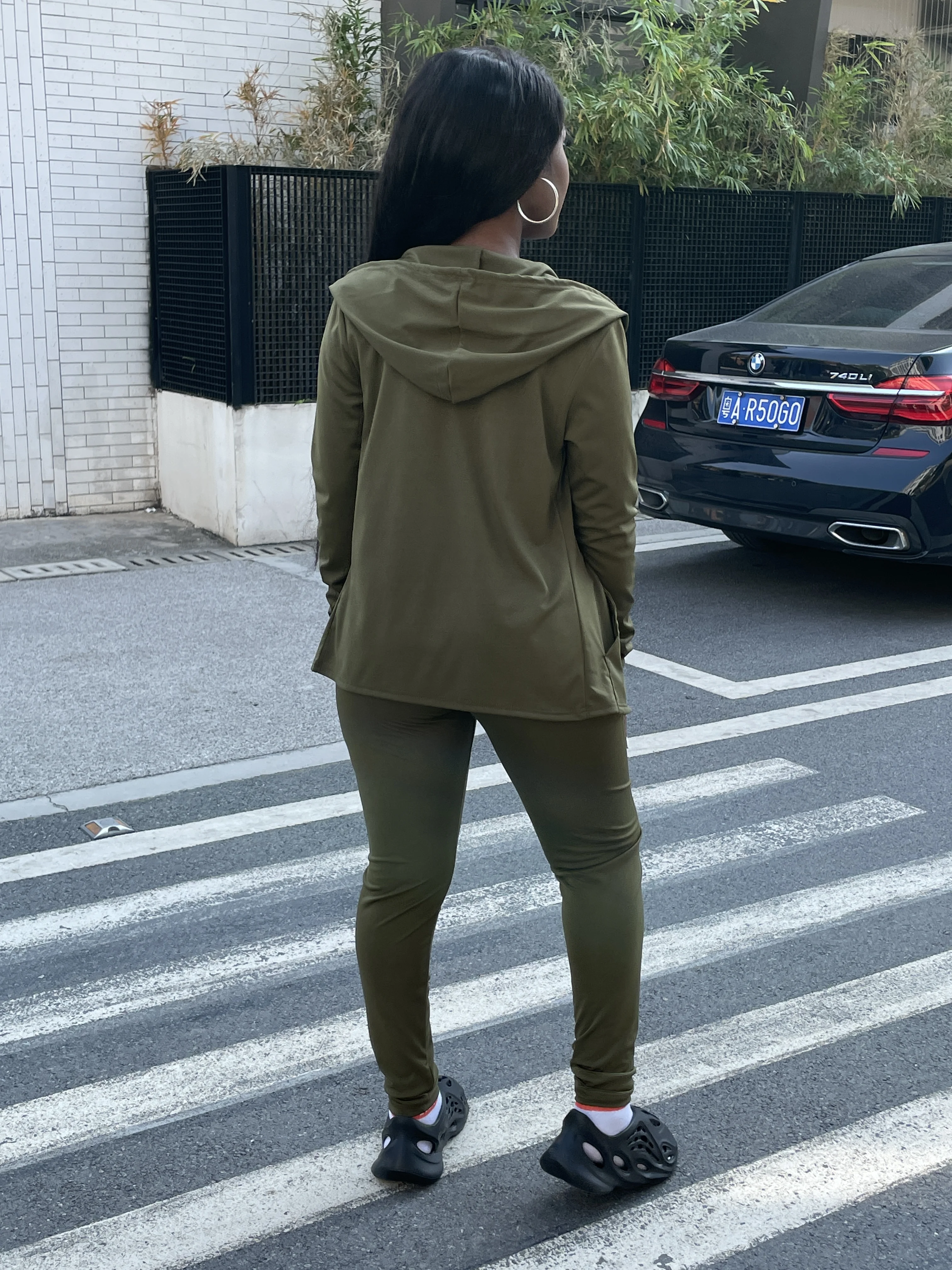 LW Autumn Two Piece Women Hooded Collar Kangaroo Pocket Tracksuit Set Pleated Hoodie Jacket +Leggings Workout Matching Suits