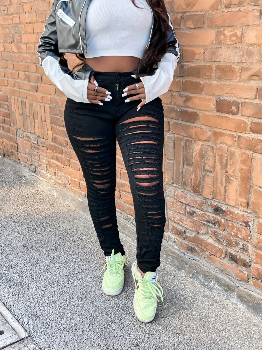 LW Plain Trendy Denim Mid Waist High Stretchy Ripped Solid Skinny Jeans Hollow-out Street Skinny Fashion Pencil Pants For Women