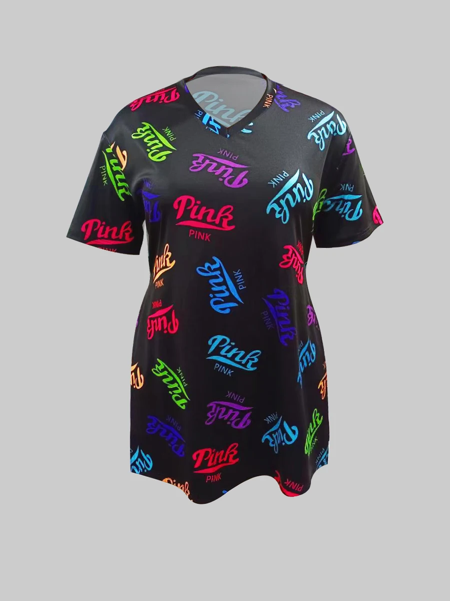 LW Plus Size 2023 Women Summer Sporty Set Pink Letter Print Split Shorts Set O-Neck Tee Tops+Pencil Shorts for Gym Jogging Outfi