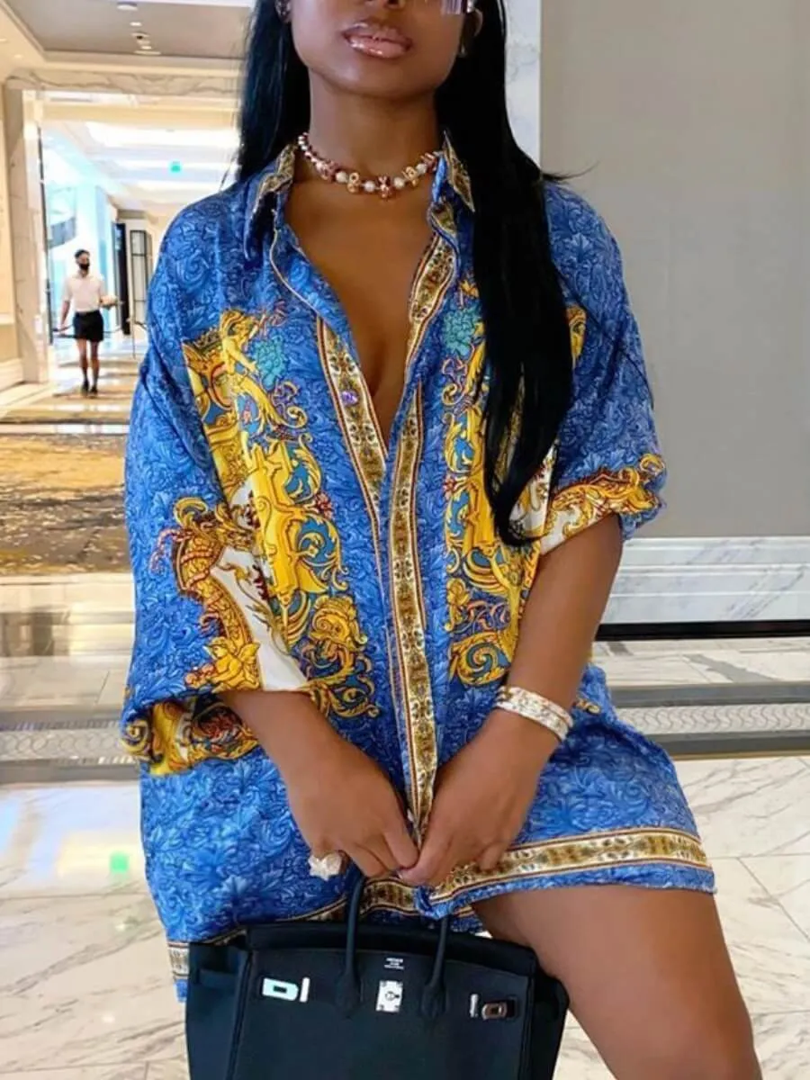LW Plus Size Button Design Mixed Printing Shirt Dress Fashion Stylish Turndown Collar Boho T-shirt Plain Loose Streetwears