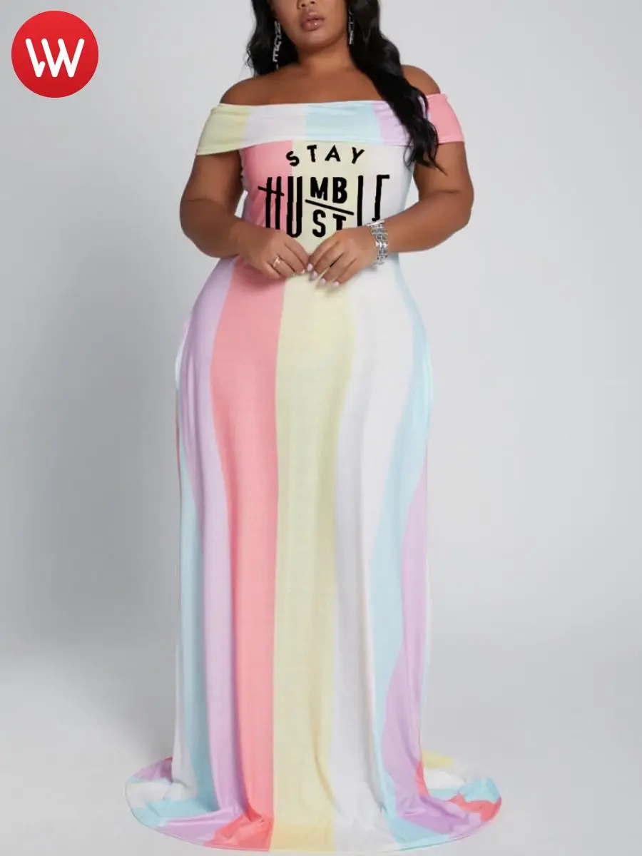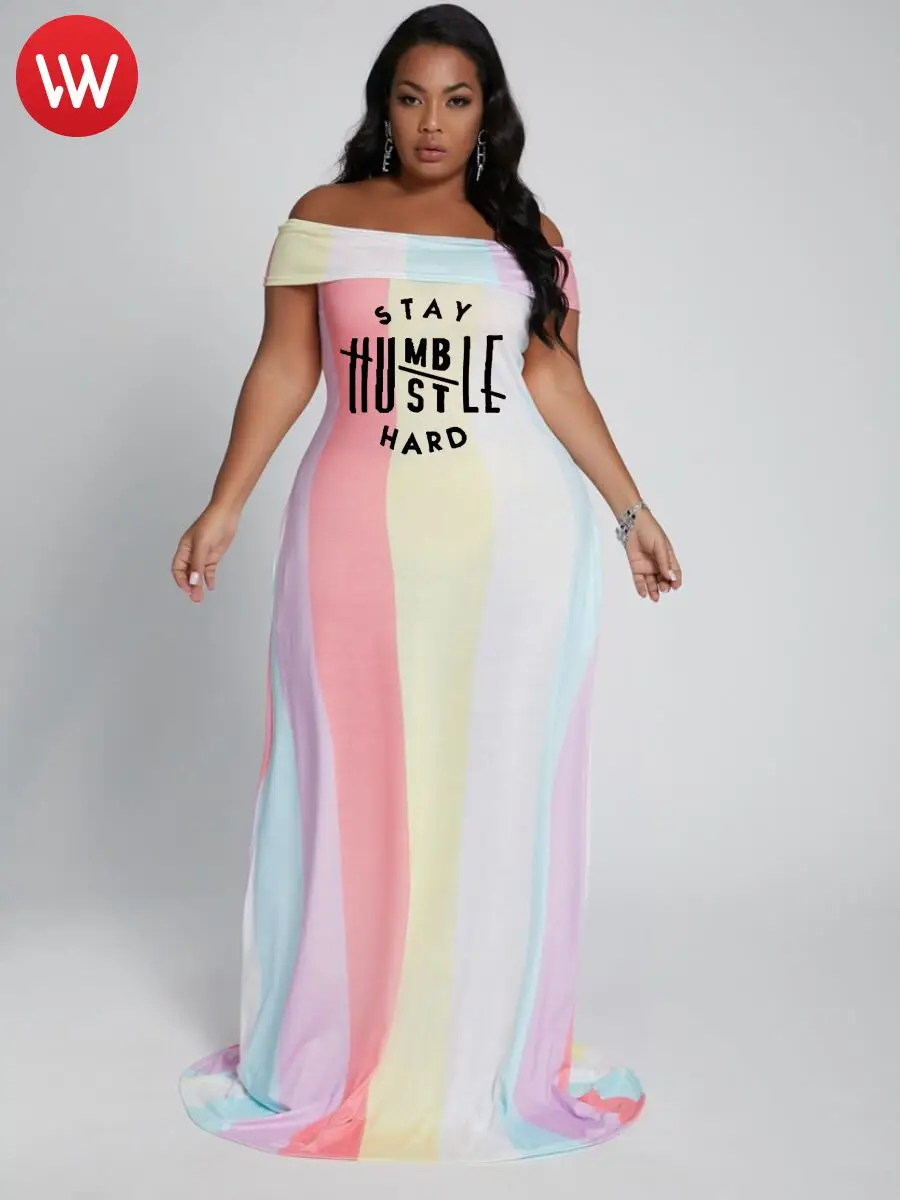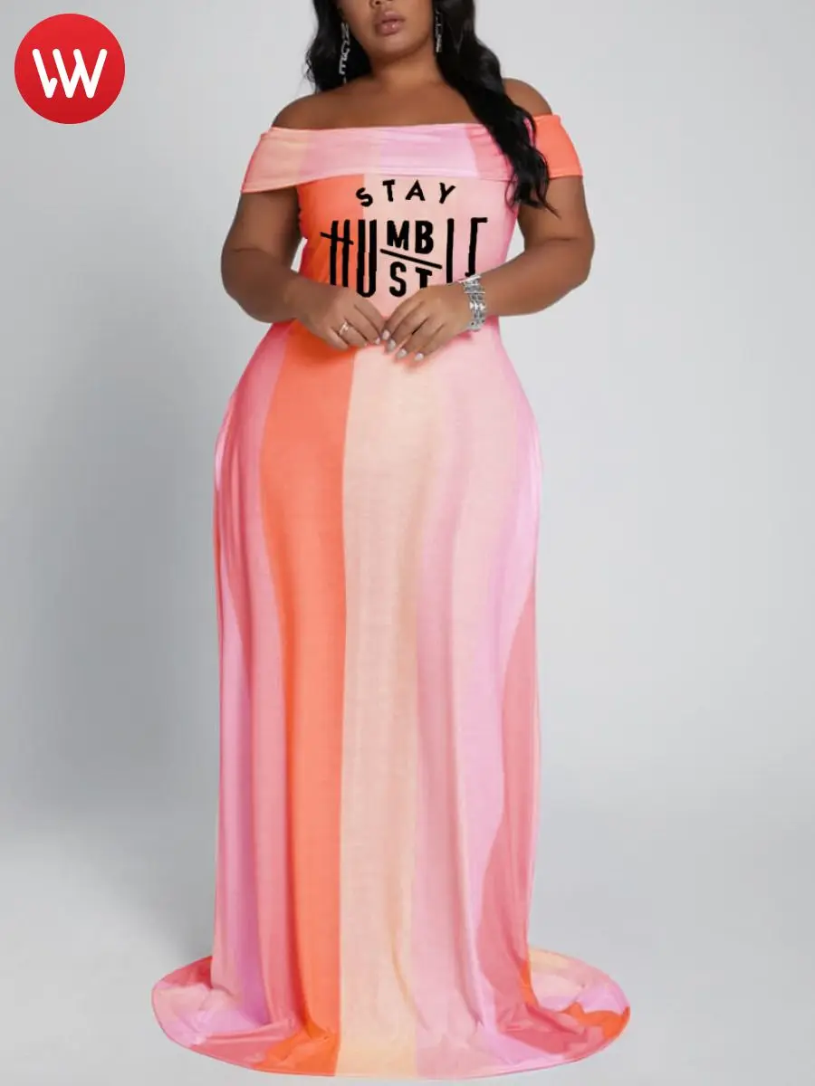 LW Plus Size Dress Boho Fold-over Letter Print Striped Orange Trailing L-5XL Off The Shoulder Vacation Summer Vestidos