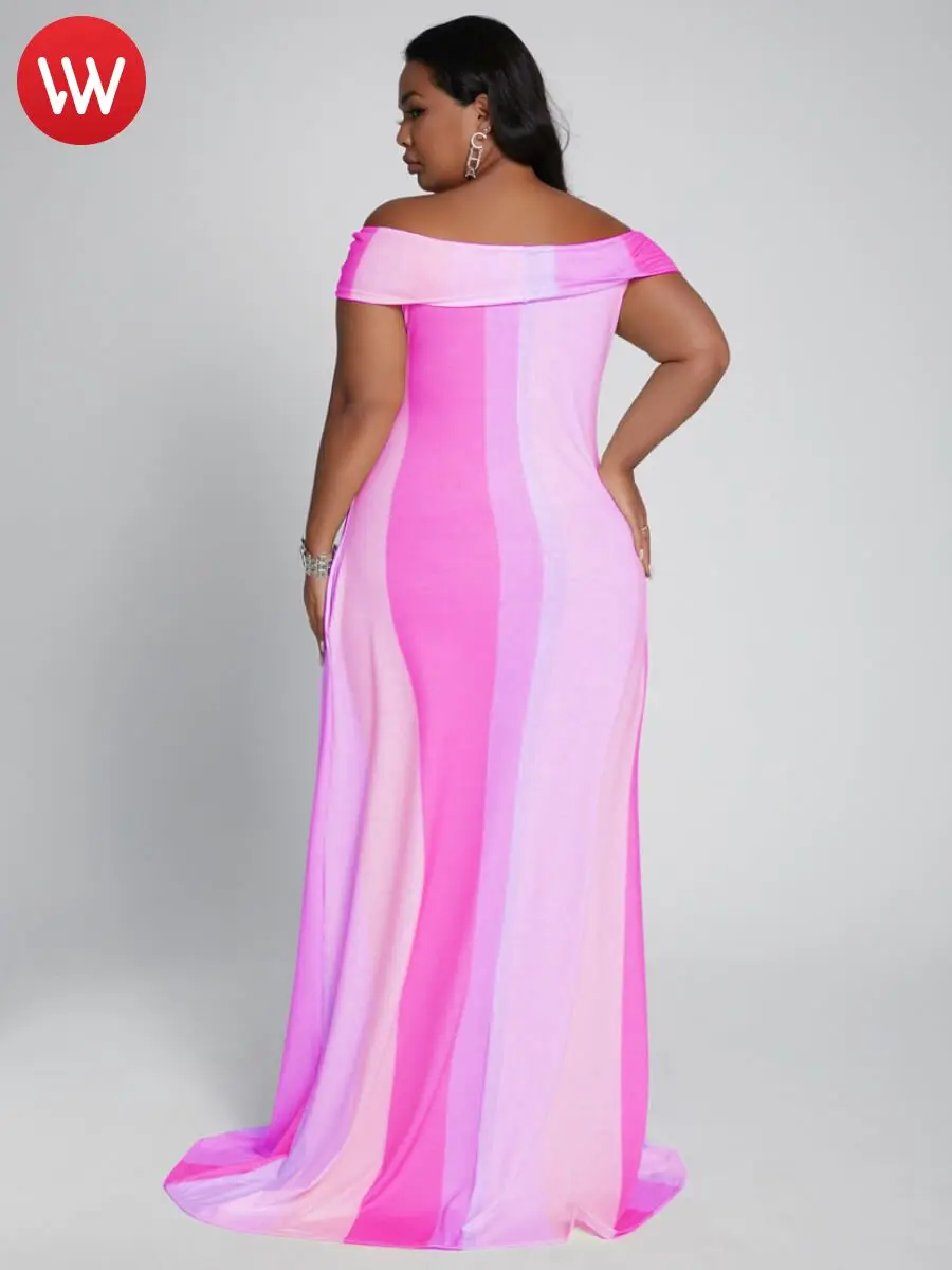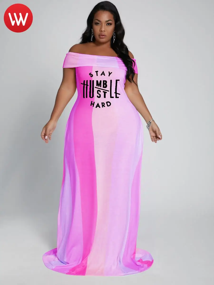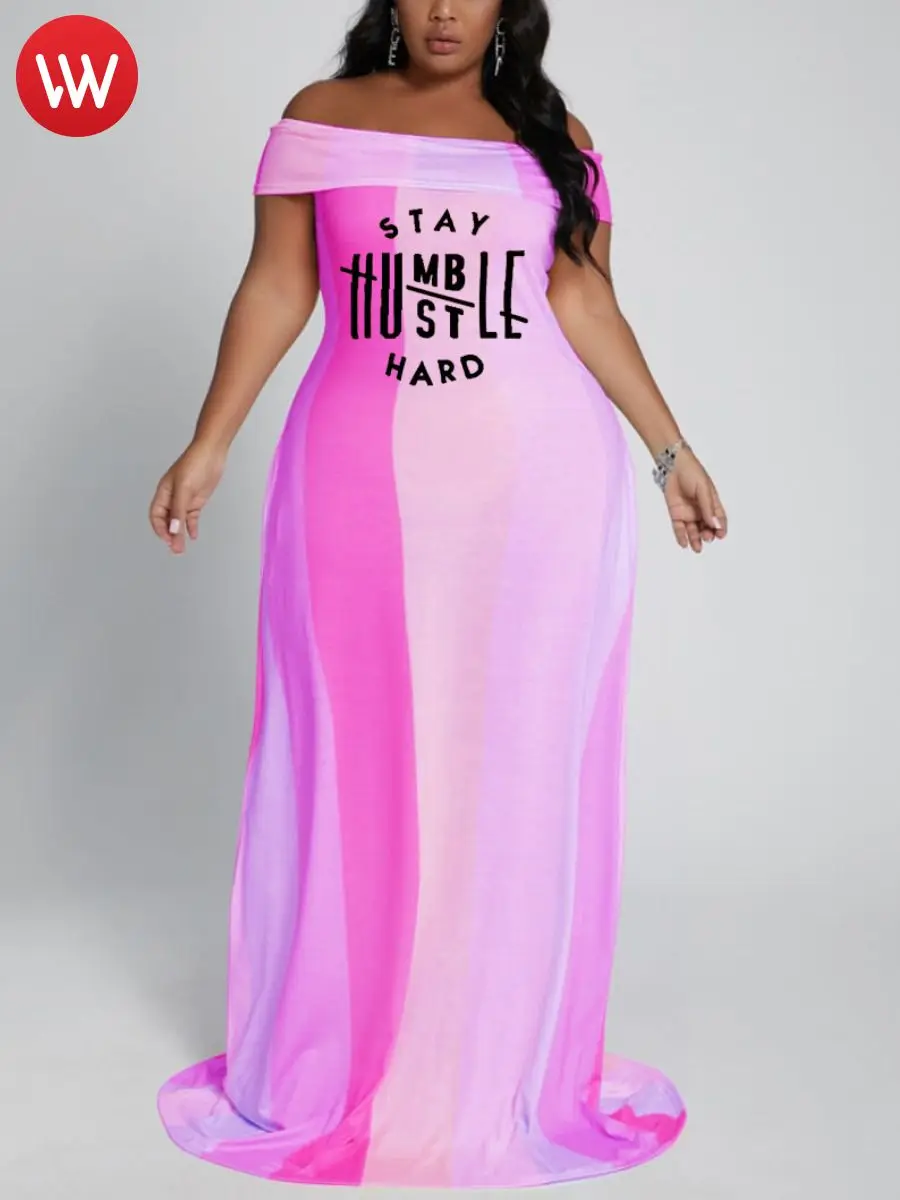 LW Plus Size Dress Boho Fold-over Letter Print Striped Orange Trailing L-5XL Off The Shoulder Vacation Summer Vestidos