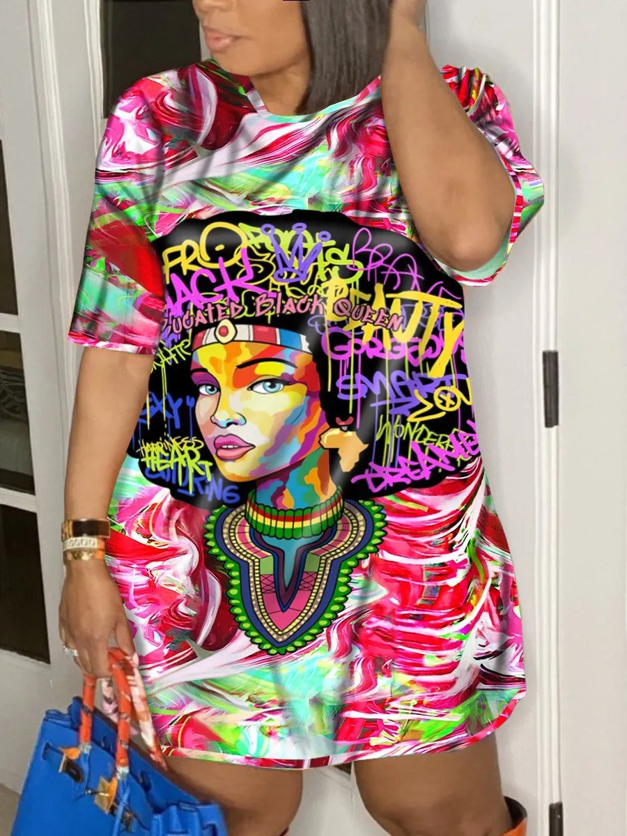 LW Plus Size Figure Street Letter Print Patchwork Blue Knee Length Dress Oversized T-shirt Women Summer Y2K Outfit Boyfriend Tee