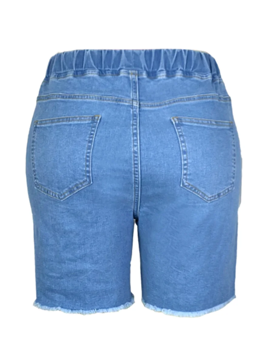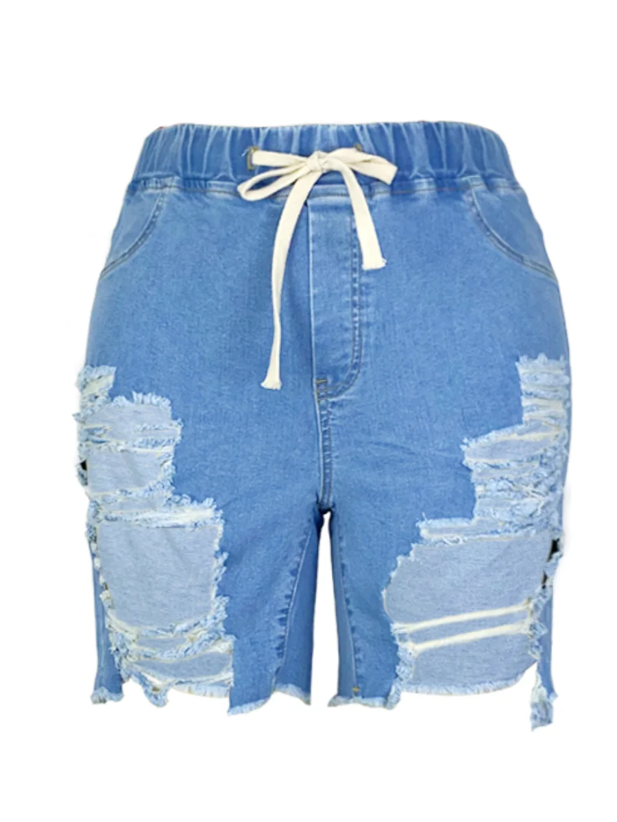 LW Plus Size Ripped Drawstring Denim Shorts Casual Solid Color Daily Stretchy Holes Summer Jeans