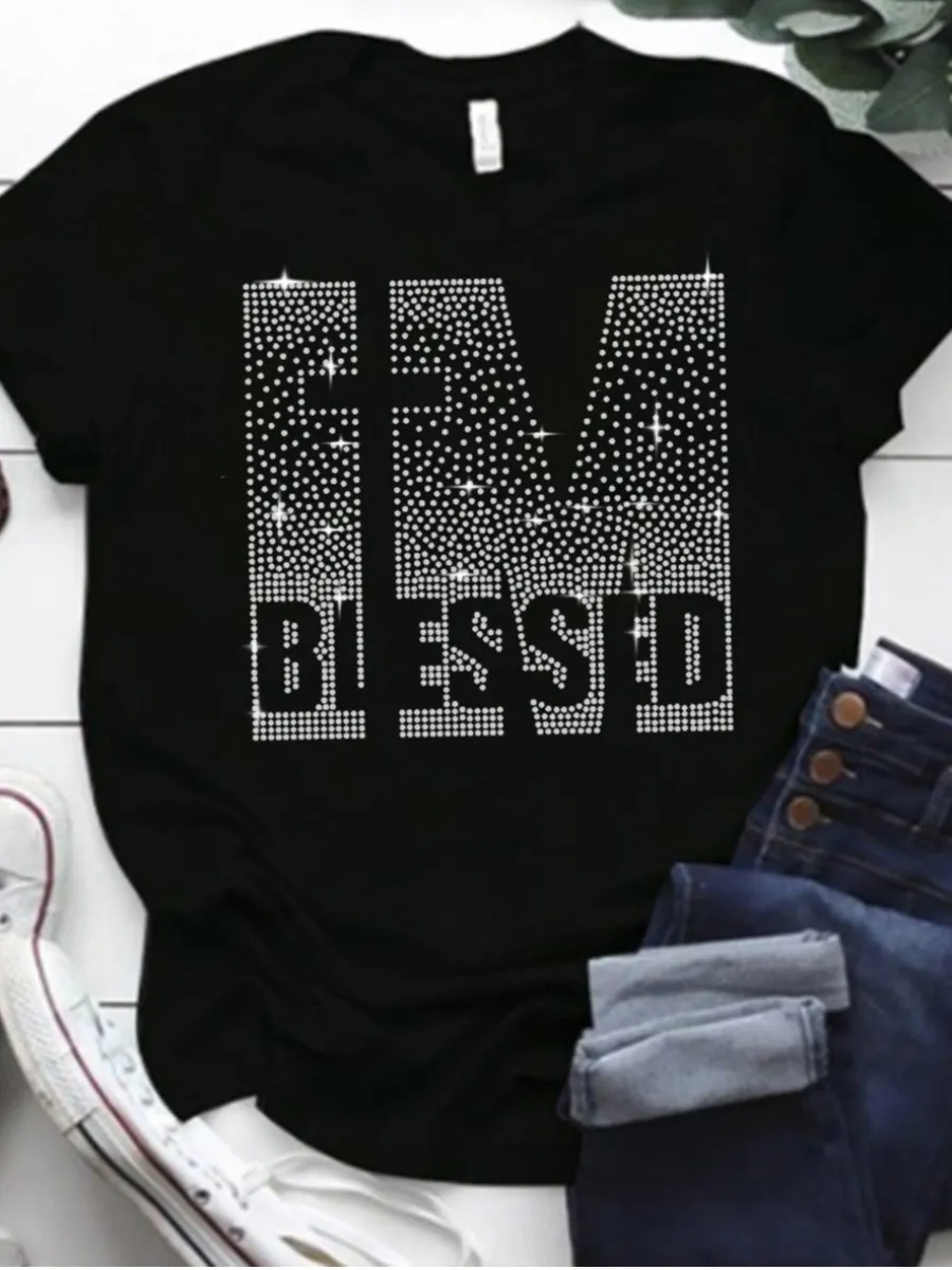 LW Plus Size Summer Women Round Neck Tee Tops Rhinestone Blessed Letter T-shirt Casual Short Sleeve Crop Tops Sexy T-shirt