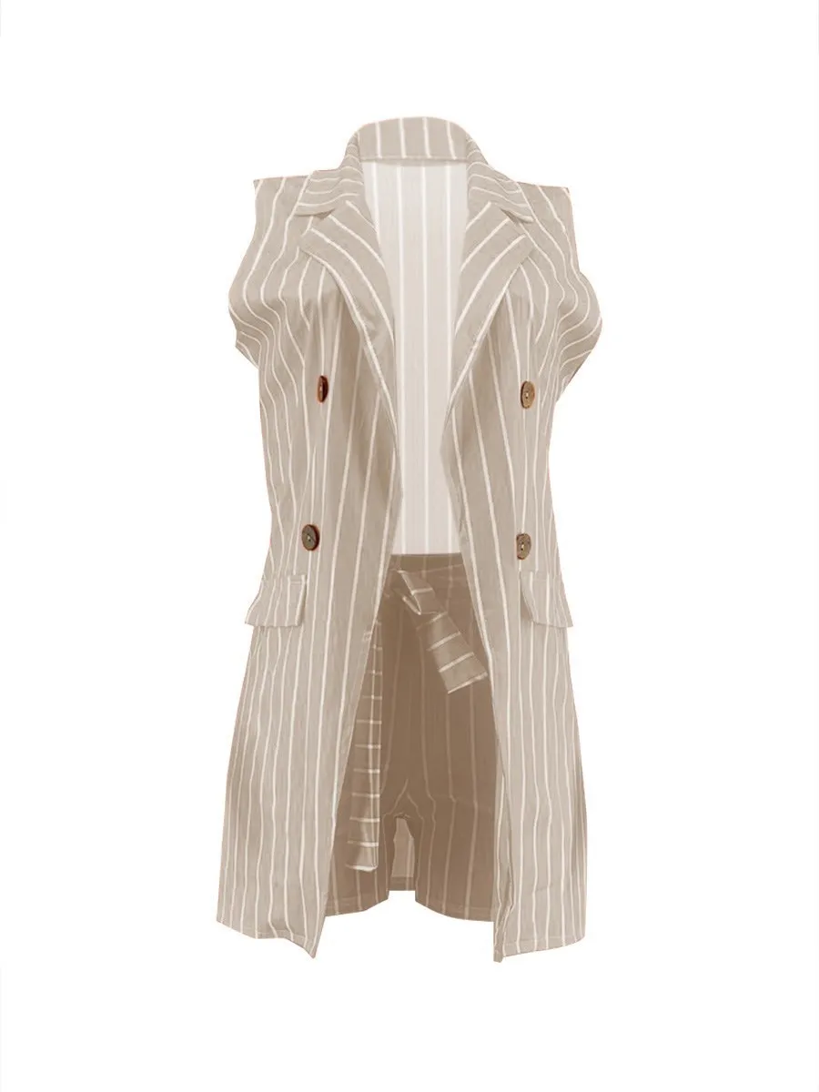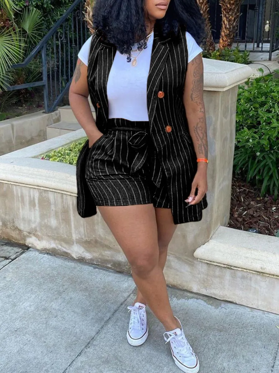 LW Plus Size Woman Clothes Office Lady Two-Piece Striped Bandage Design Small Suit Vest Jacket + Shorts Set (Without T-shirt)