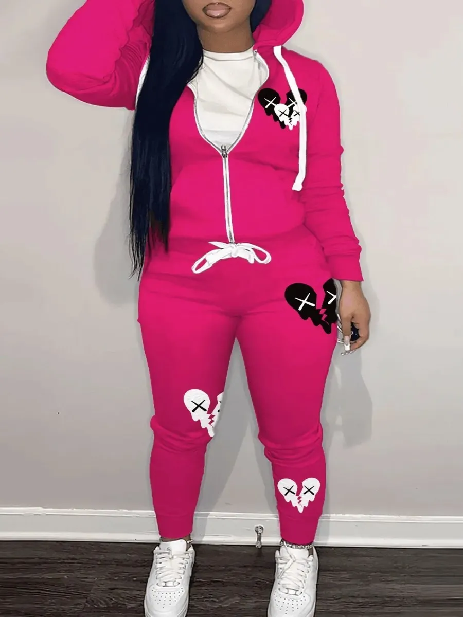LW Simple Two Piece Set Women Casual Sporty Long Sleeve Zipper Design Top Hooded Collar Broken Heart Print Female Tracksuit Set