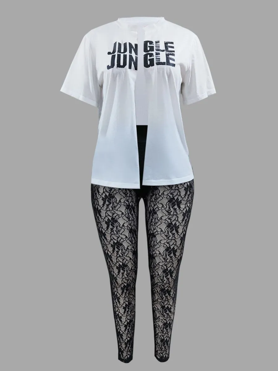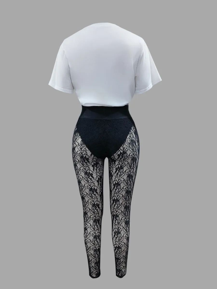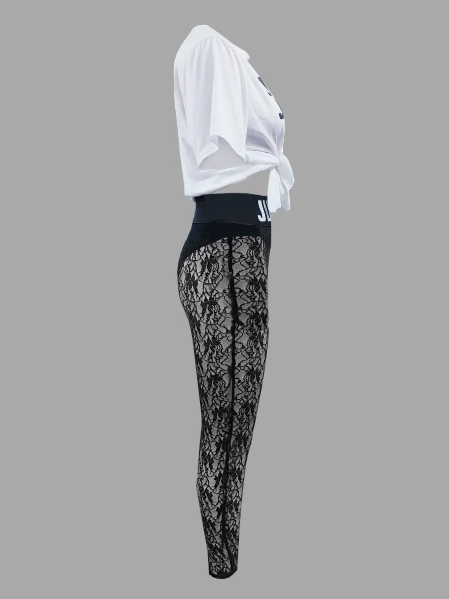 LW SXY 2PC Letter Print Split See-through Pants Set Short Sleeve V Neck Short Tee&Trendy Sheath Lace Sporty Leggings 2 Piece Set